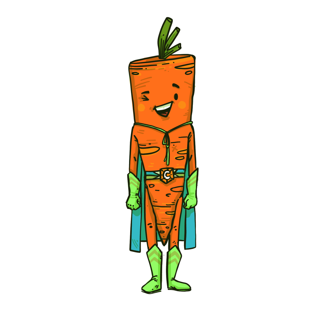 Căpitanul Caroten – Un morcov curajos și plin de beta-caroten! Căpitanul Caroten ajută la protejarea vederii și este mereu gata să scaneze problemele dintr-o masă nesănătoasă. El luptă pentru sănătatea ochilor și este liderul neînfricat al echipei.
